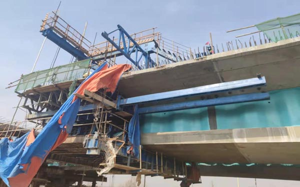 6、在底模蕩移前,必須詳細(xì)檢查掛籃位置、后端壓重及后吊桿安裝情況是否符合要求。應(yīng)先將上橫梁兩個吊帶與底模下橫梁連接好,確認(rèn)安全后,方可蕩移。
